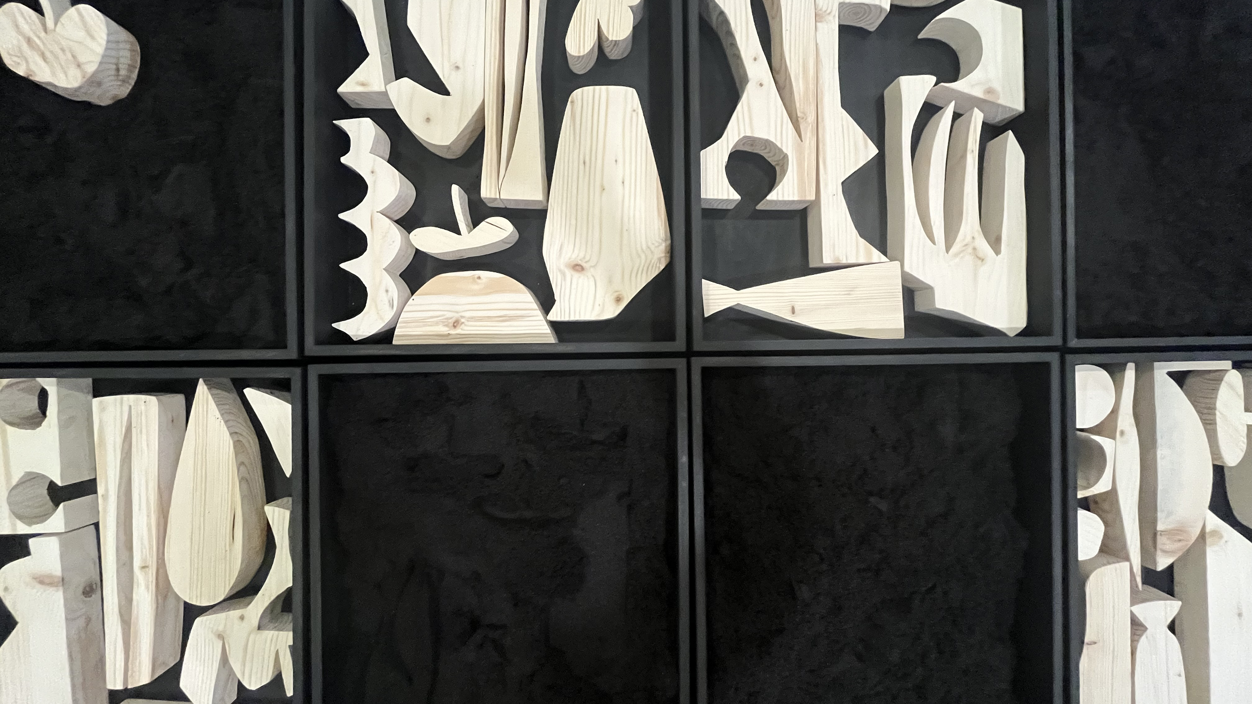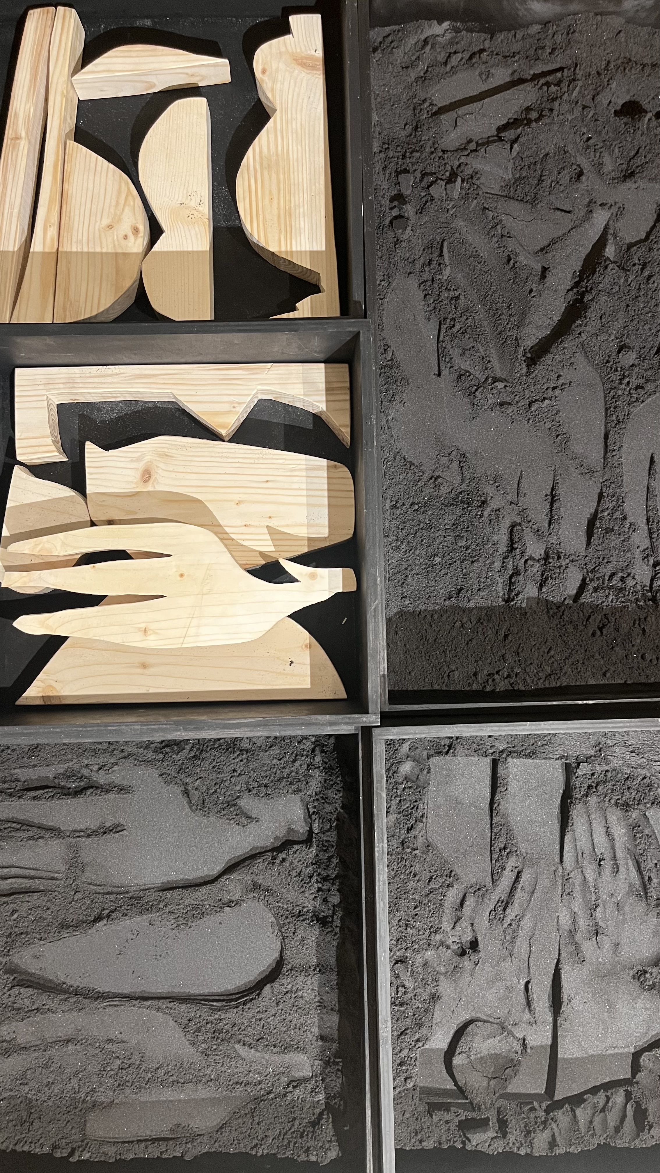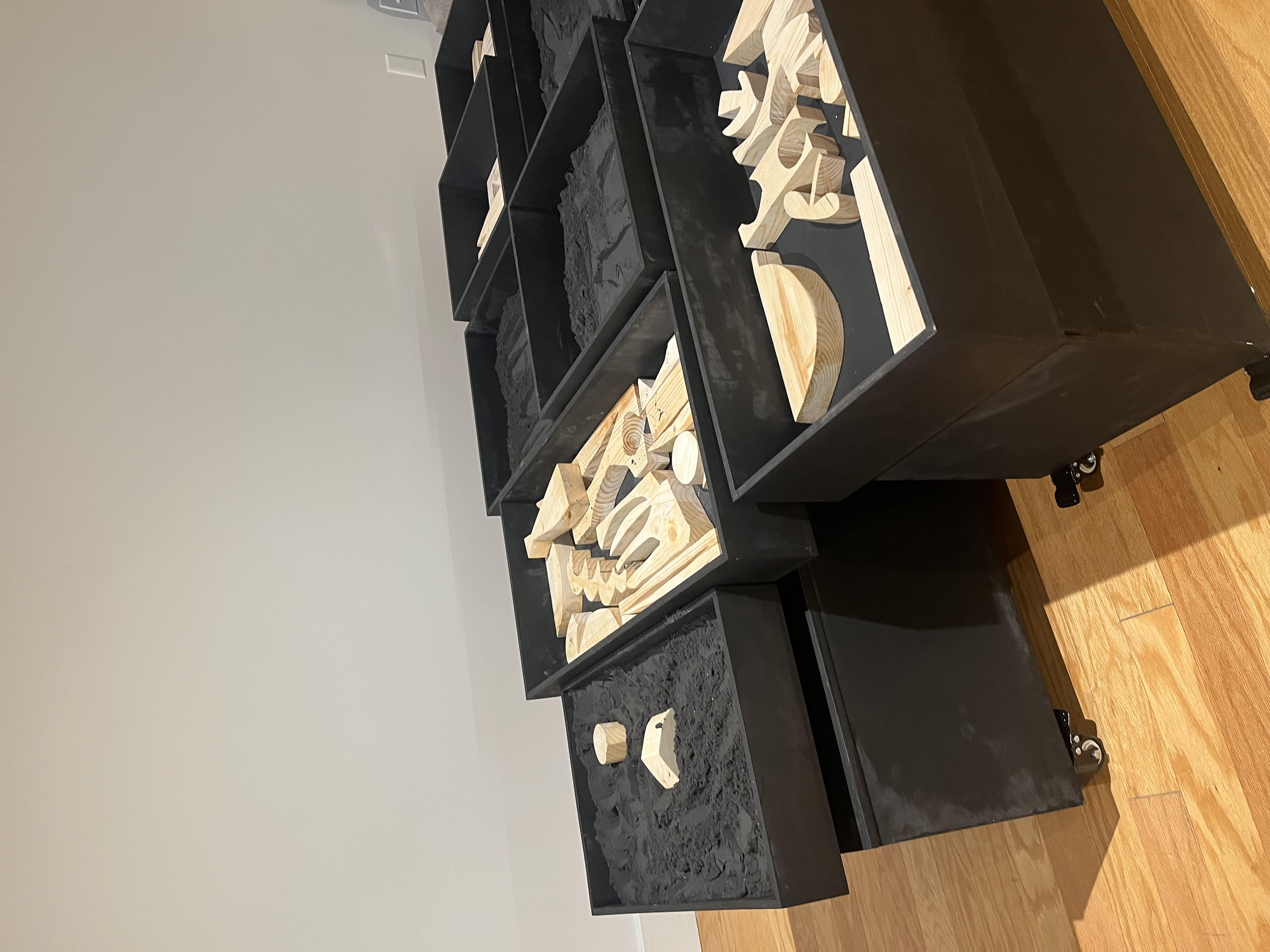 Monotype stencils are traced on wood and cut out to create shape blocks. Like the paper shapes, pressed against the printing paper to create an embossment, the blocks could be handled and used to emboss sand. Sandboxes became one of the first widespread play structures in Germany around 1908. Connecting earth, building, and imaginary play, I wanted to take the experience of the sandbox and turn it into a drawing tool. Participants each found their strategies for making images, building around the blocks to create an edge, placing blocks side by side to form new shapes, and agitating the sand to introduce air and make it easier to emboss. The trays and sand, saturated black, contrast existing expectations about what a sandbox looks like. Carefully crafted, the formal context elevates play to be in dialogue with the artwork without losing the beauty of the sand’s informality. These trays, displayed in a grid, lead people to collaboratively compose across images. The sand becomes a never-ending substrate for drawing. Adgetate the surface with your fingers and start again. Louise Nevelson’s sculptures made from scavenged materials on the streets of New York were an inspiration for this work. Turning to found materials during wartime rations in the 1940s, Nevelson composed her environment into artwork through shape. Composed in black boxes that were easier to handle, she combined them together to create monumental forms. My sandboxes, raised on stilts are placed on pedestals with caster wheels, are designed to be reconfigured and moved around. To bring the gallery closer to the playground and bring artwork into the park.